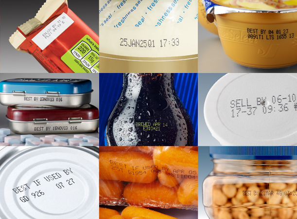 Exemple de marquage DLC et numéro de lot en couleur jaune sur plastique avec Videojet 1580